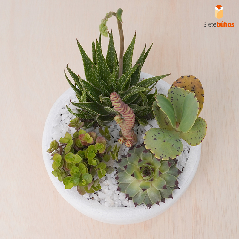 - 1 suculenta mediana y de 4 a 6 suculentas pequeñas según el tamaño de las plantas.