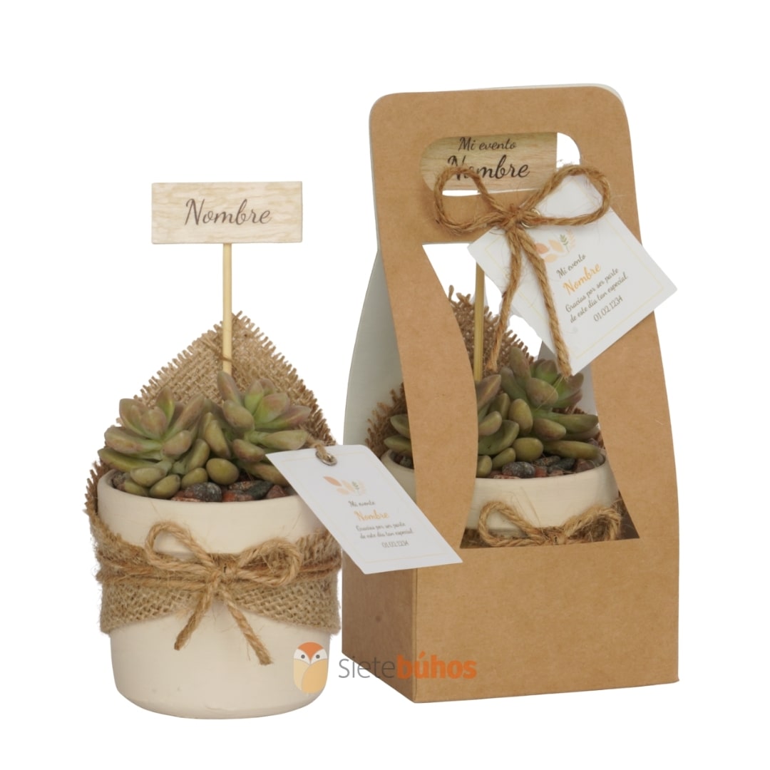 Recuerdos 7 cm con suculentas o cactus con borde arcilla crema