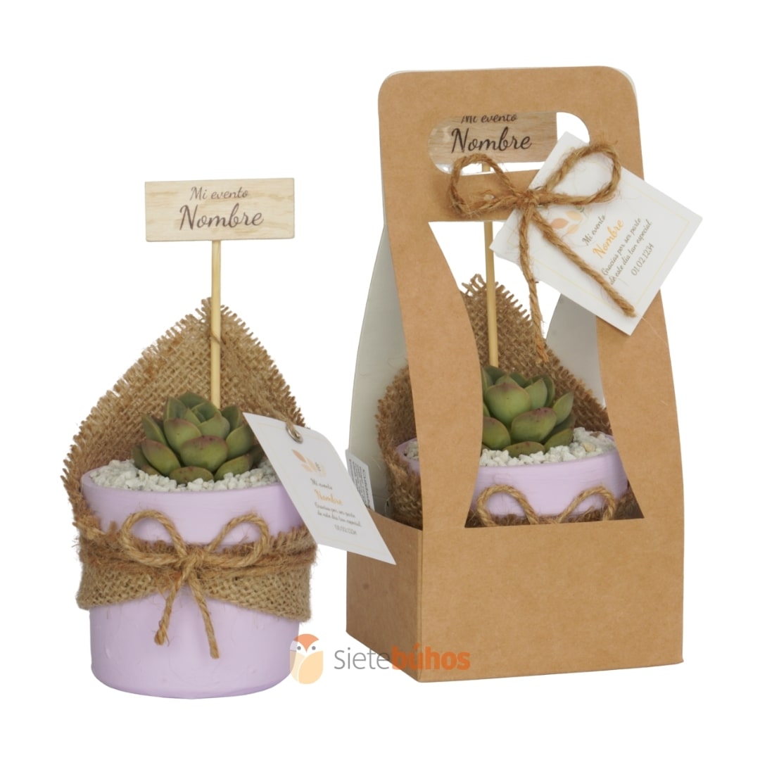 Recuerdos 7 cm con suculentas o cactus con borde arcilla lila